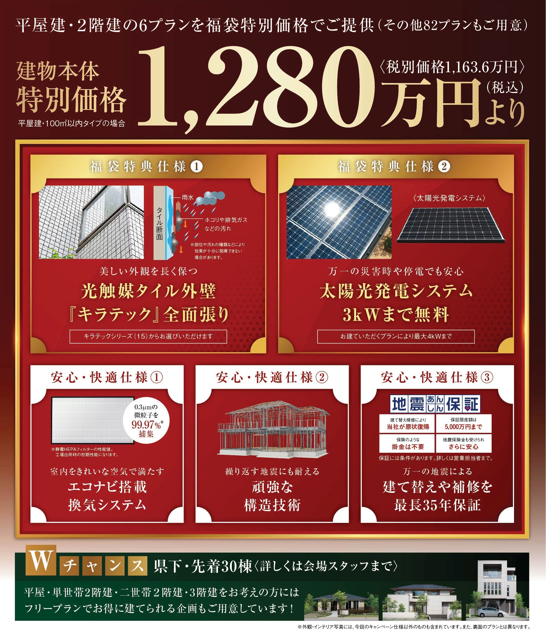 タイル外壁張り、太陽光発電システム搭載、フリープラン・特別価格でお建てするものです。